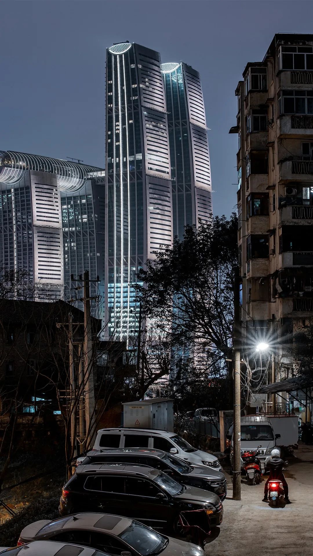 路灯下的南岸老城区显得格外宁静,与对岸灯火通明的现代建筑形成强烈的冲突对比,这也是重庆独具特色的场景。