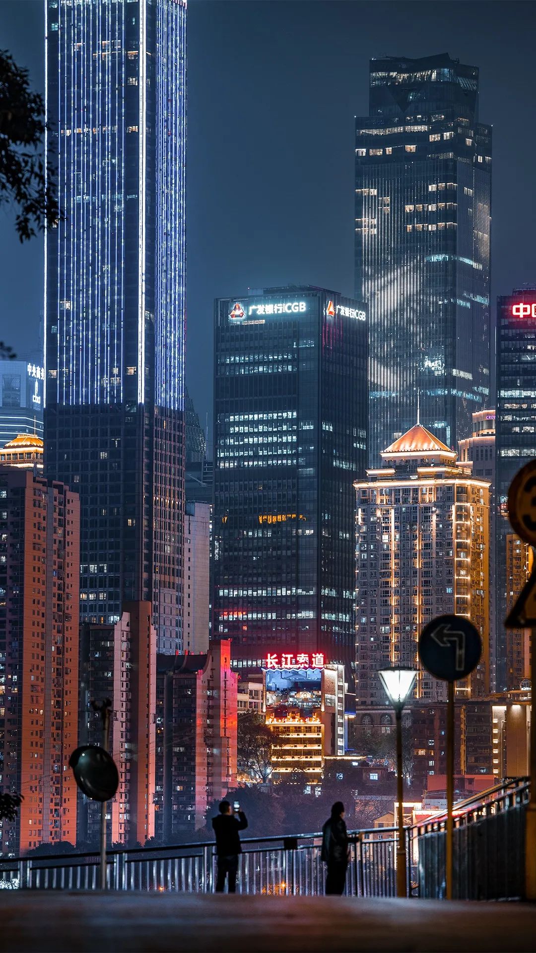 在充满赛博朋克感的城市背景下,两位观赏夜景的市民仿佛成为了画面中的主角,看起来既真实又科幻。