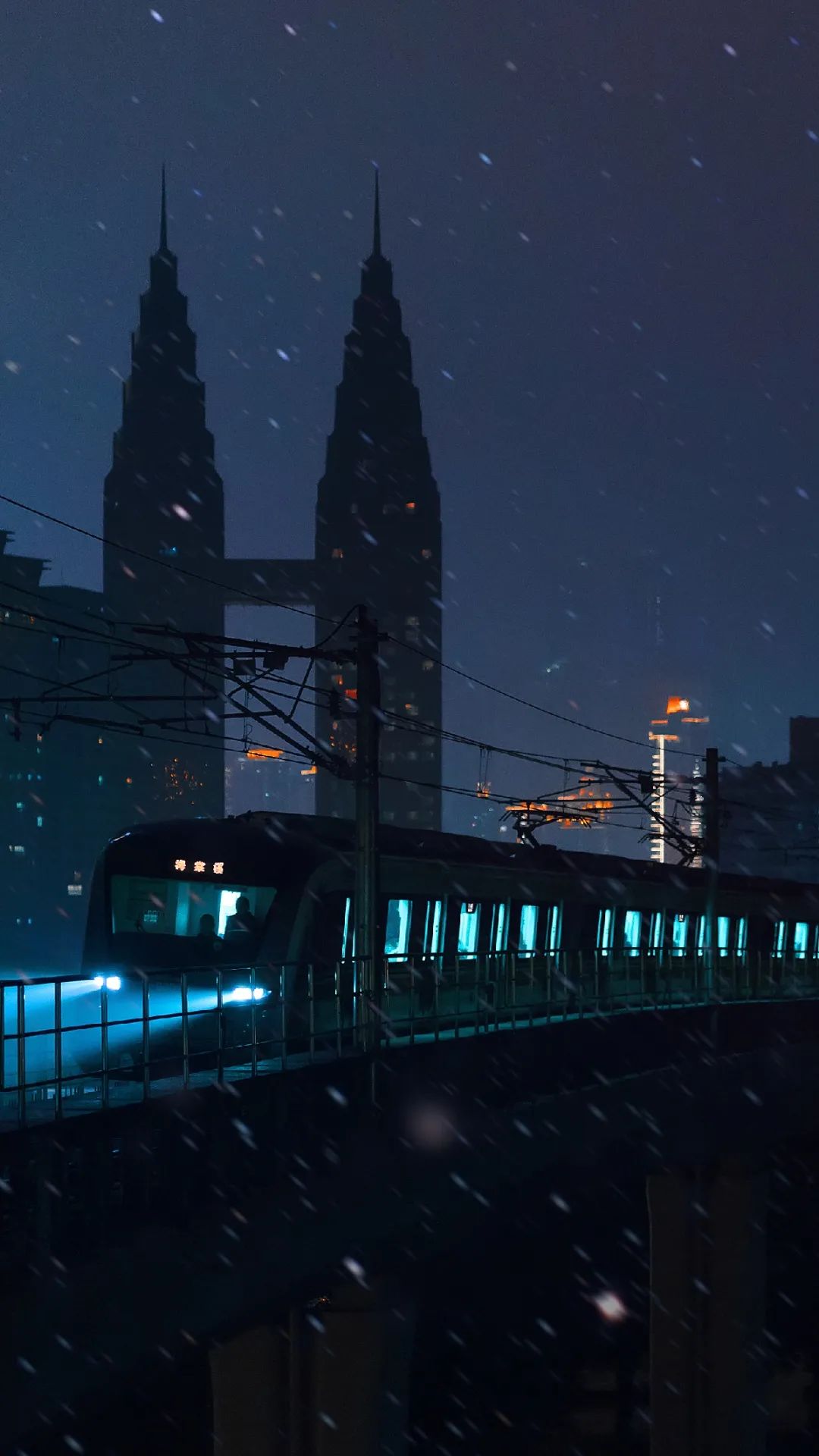 夜幕中驶来的地铁,像极了电影里的画面。