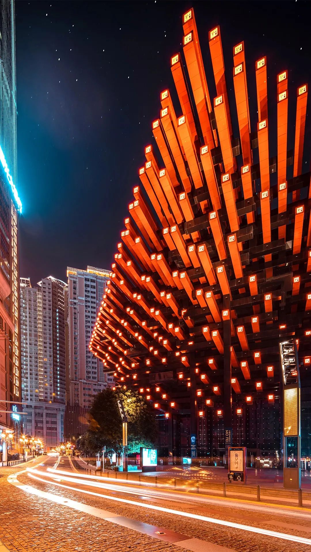 仰视国泰艺术中心,灯光勾勒出“筷子”的轮廓,像火一般热烈的红色,充满浪漫色彩。
