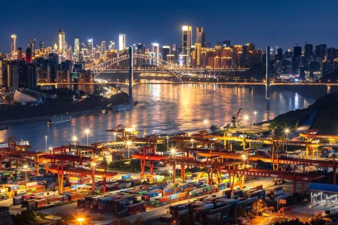 夜幕下的寸滩港依旧繁华如织,蜿蜒流淌的长江倒映着层峦叠嶂的城市夜色,彩色集装箱在灯光映衬下显得格外靓眼,内陆国际物流枢纽的繁忙瞬间定格于此。