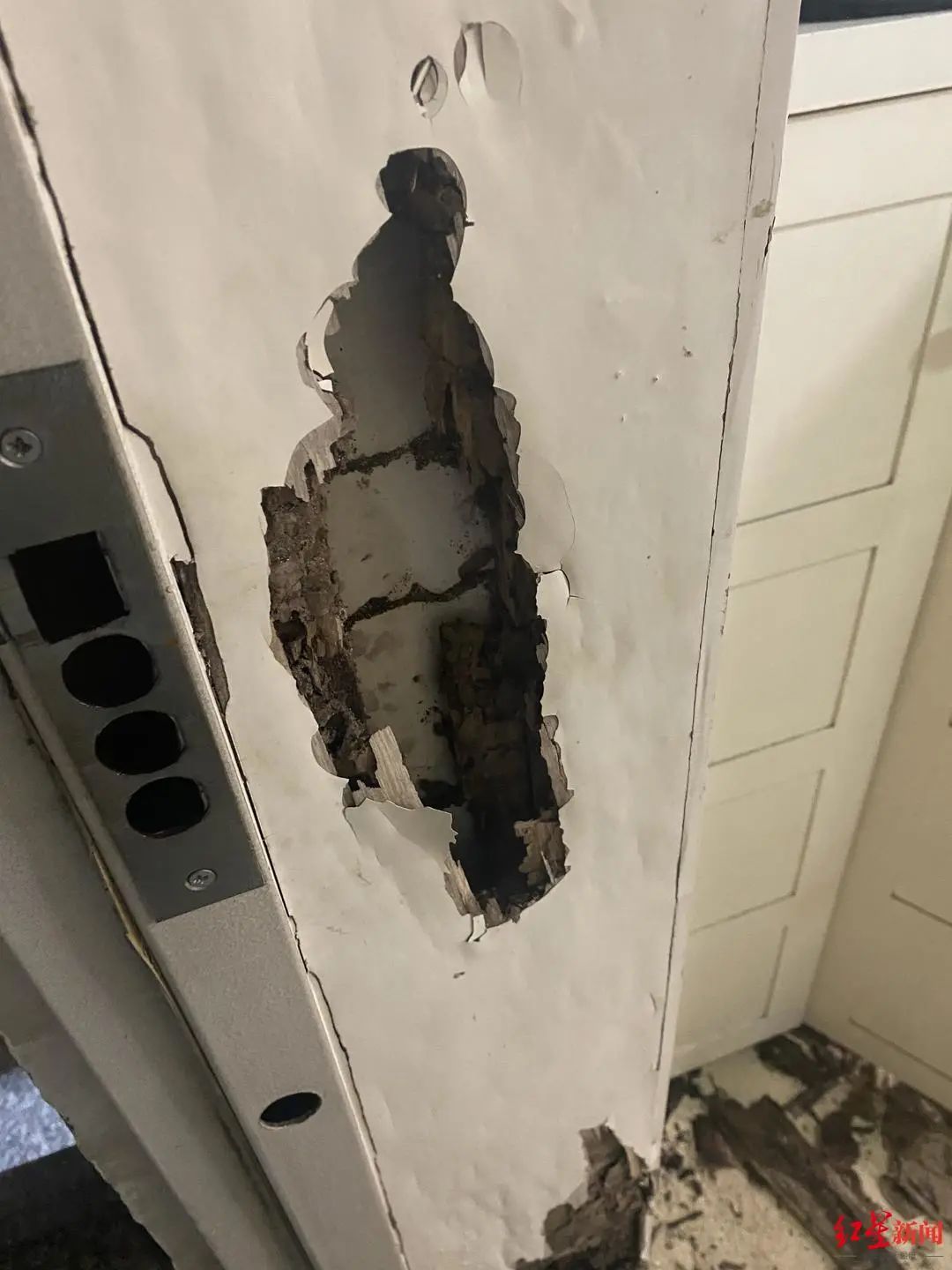 一进入住户大门,便能看到大门门框已经有多处坑洞,用手一戳,便能在木质门框上戳出洞。“白蚁已经将门框内部啃食空了,有时候外表是好的,里面已经蛀空了。”