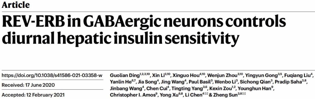 2021年3月24日,Nature杂志在线发表了题为“REV-ERB in GABAergic neurons controls diurnal hepatic insulin sensitivity” 的研究论文。该研究由复旦大学附属妇产科医院/生殖与发育研究院丁国莲课题组与美国贝勒医学院孙正课题组以及山东大学齐鲁医院陈丽课题组等合作完成。