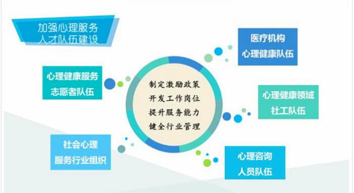 《工作方案》要求加强心理服务人才队伍建设,一是发展社会工作专业队伍,鼓励和支持专业社会工作者参与心理健康服务。二是培育心理咨询人员队伍,吸引有心理学专业背景人员和经过培训的心理咨询人员从事心理健康服务。三是发展医疗机构心理健康服务队伍,提升医疗机构心理健康服务专业人员数量和服务水平。四是组建心理健康服务志愿者队伍,鼓励和规范心理健康志愿服务的发展。五是健全心理健康行业组织,并加强管理。