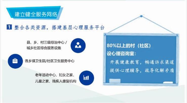 二是完善社会心理服务网络。包括提高基层社会心理服务平台搭建比例,完善学生、员工心理健康服务网络,提升医疗机构心理健康服务能力。