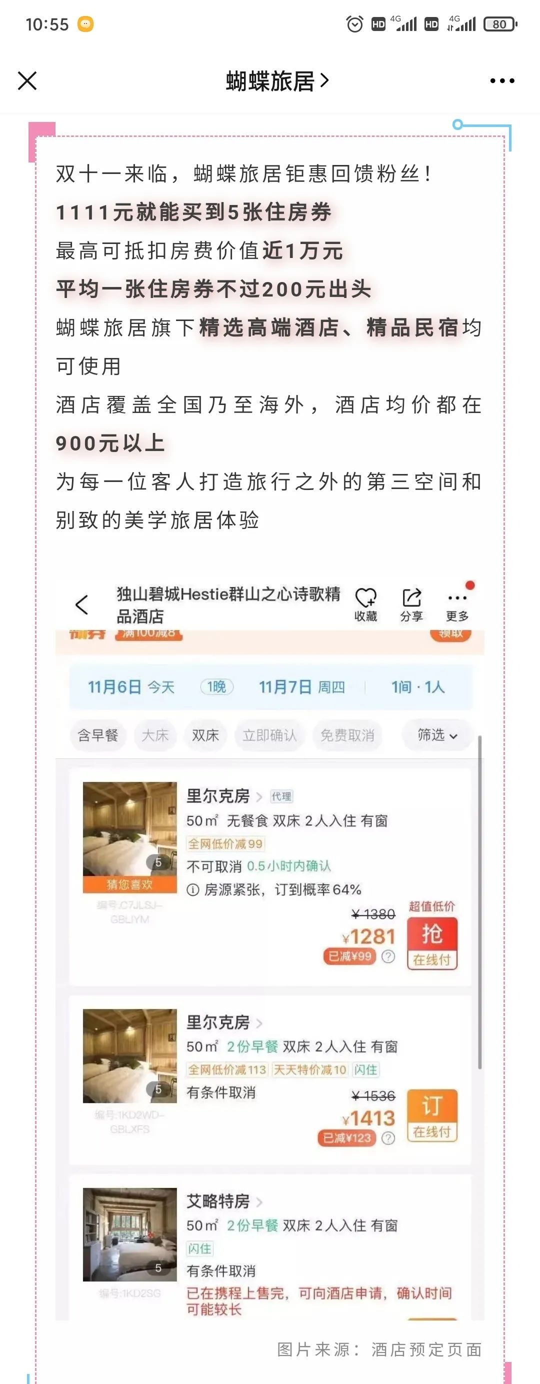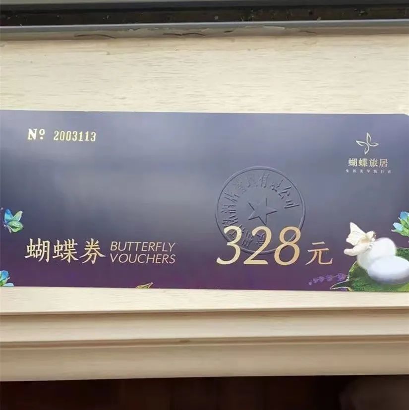 “蝴蝶券是蝴蝶旅居推出的一种入住酒店的优惠券,买了蝴蝶券后,就可以找客服或线上预订档次不同的酒店。”何女士介绍说,一些酒店用1张券就可以住一晚,一些高端酒店或者别墅则需5-10张劵。比如,贵阳周边旅游景点的酒店,价位在200-300元左右的,用一张蝴蝶劵直接就能入住了。”