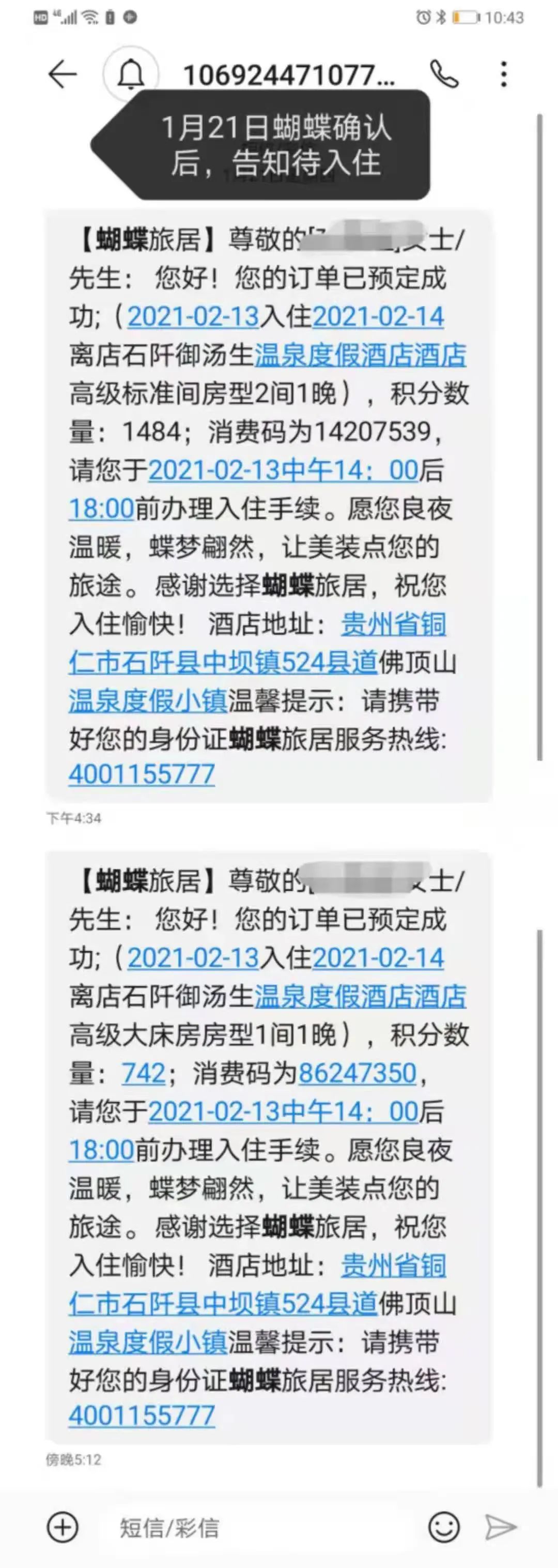 何女士使用蝴蝶券有近一年时间了。“之前一直用得挺好的,刚开始是实体券,只需打电话预定酒店,入住时拿着券去就行。2020年底,换成了电子券,就经常预定不成功了。”“最气人的是,后台明明显示酒店预定成功,但到酒店后,却没法办理入住。”2021年春节期间,何女士打算带家人来个短途旅游,于是她提前20天通过蝴蝶旅居的小程序,成功预定了2月13日某酒店的2间客房,并交了900元的订金。