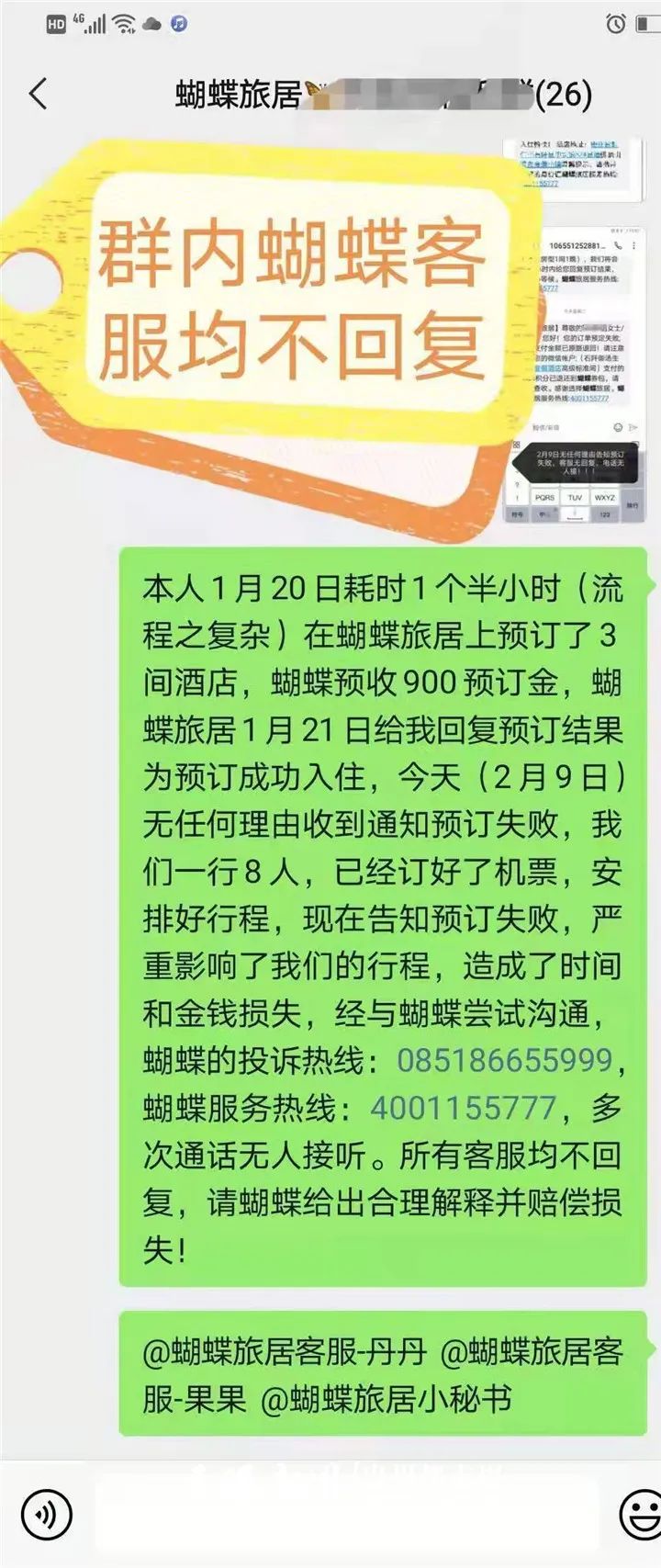 何女士马上向蝴蝶客服反映,未果,最后只能支付现金入住酒店。