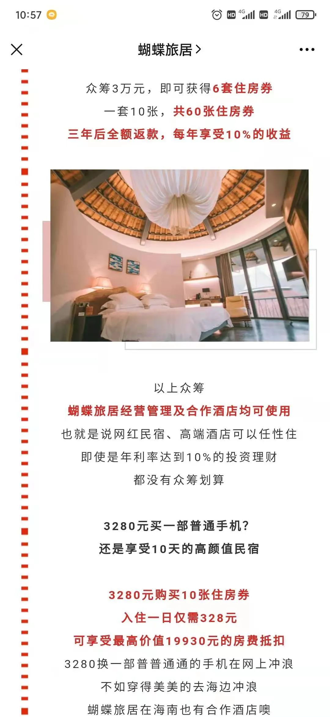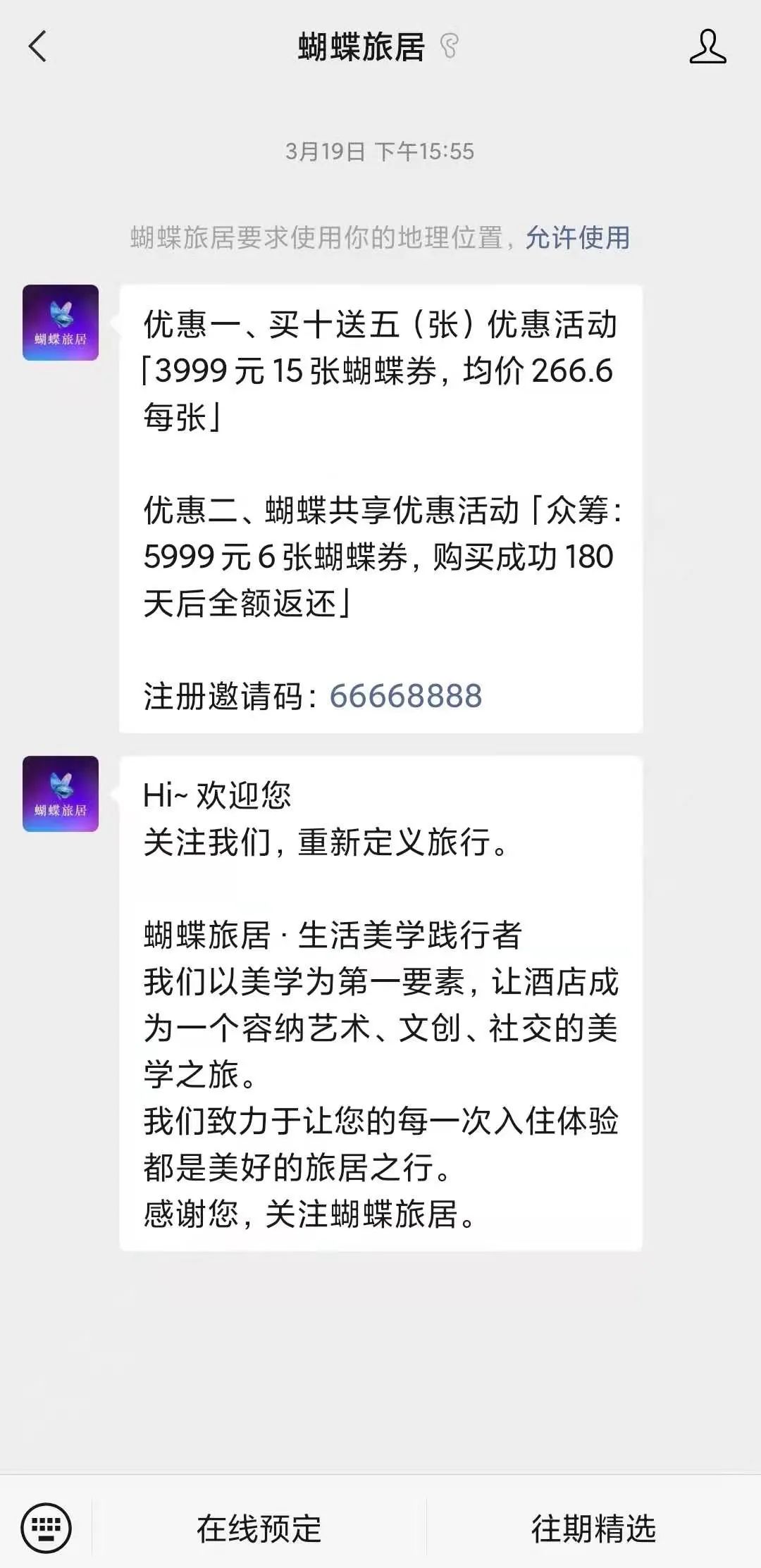 记者关注蝴蝶旅居的微信公号后,立刻收到了两种买券模式的消息,一种是3999元15张券,一种是5999元6张券参与众筹,购买成功180天后全额返还。