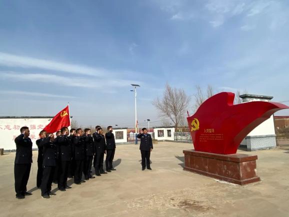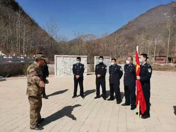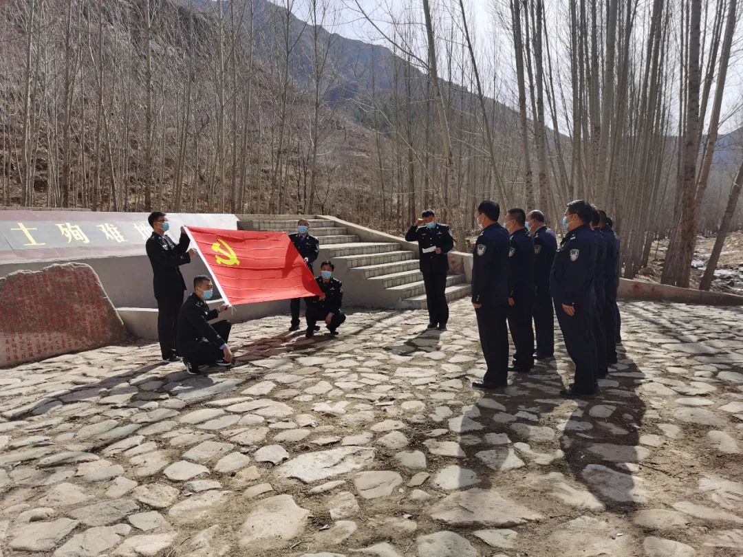 在九壮士雕塑前,必斯营子派出所、大双庙派出所、忙农派出所、五化派出所的党员民警们面对鲜红的党旗,重温入党誓词,句句誓言铿锵有力,共产主义理想信念更加坚定升华。随后在解说员的生动讲解下,党员民警们追随英雄的足迹,怀着无比崇敬的心情瞻仰了九壮士英雄广场遗址,深切感受到九壮士当年浴血奋战的艰辛历程和不怕牺牲的英雄气概。
