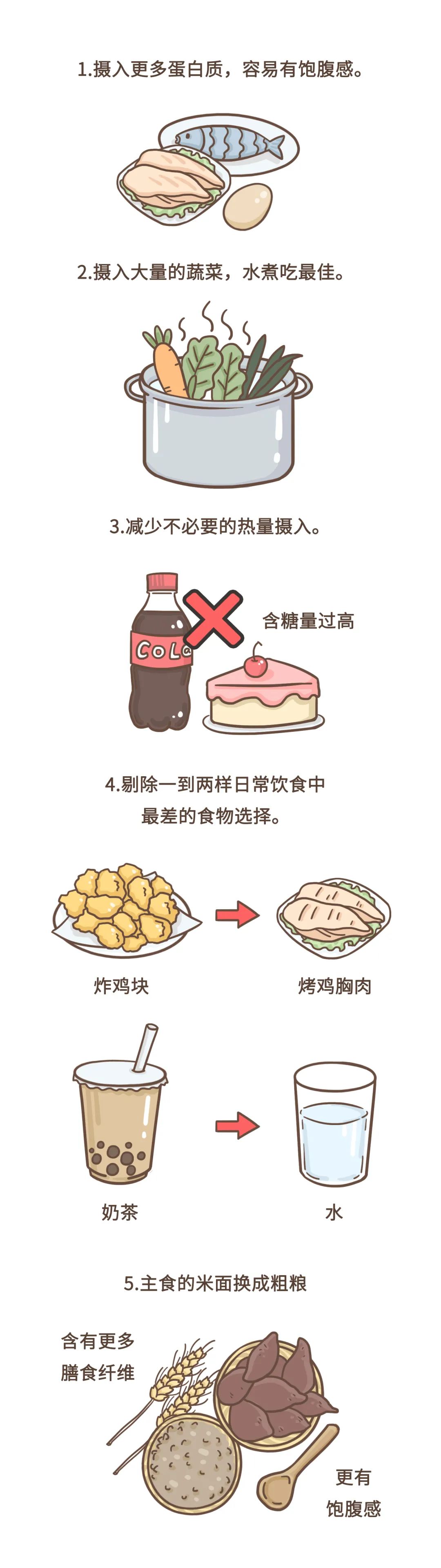注意:节食减肥不可取!因为节食时,身体会自动降低代谢率来保存更多热量,摄入少的同时,消耗也少了,一来二去等于没减肥,还苦了自己。