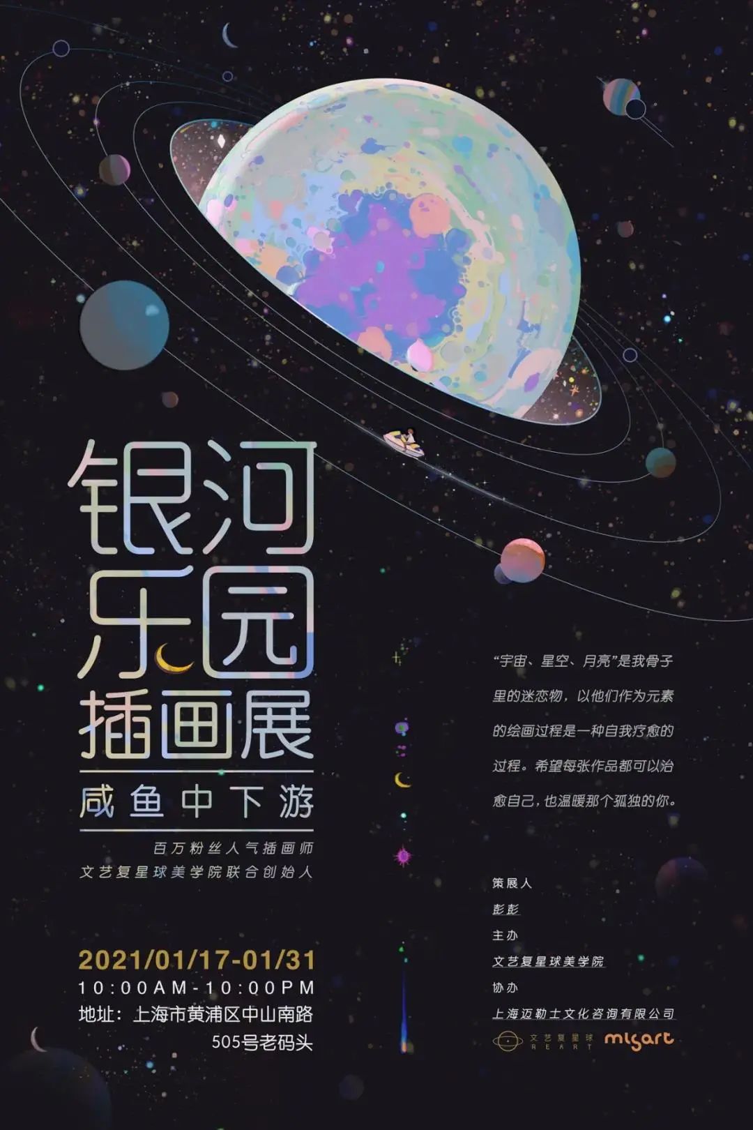 展出咸鱼中下游《宇宙三部曲》中《百年孤独》、《银河乐园》两部曲,约100余件高清微喷原画作品。这些作品见证了咸鱼中下游从一个绘画零基础“小白”到拥有百万粉丝的人气插画师的华丽蜕变。02