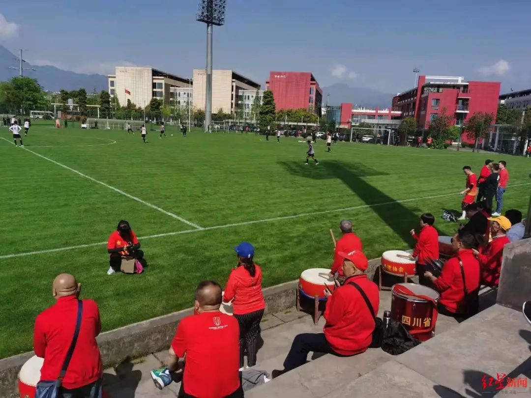 球迷用锣鼓声为球队训练助威