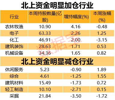 11个申万行业遭北上资金减仓,采掘行业减仓最为明显,减仓幅度为3.5%,其他减仓较多的行业还包括轻工制造、建筑材料、综合等。