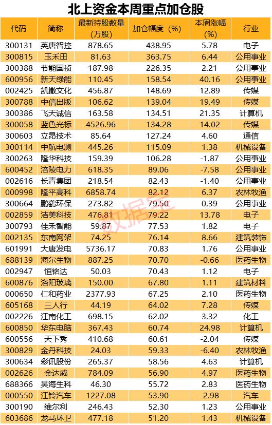 从市场表现来看,本周北上资金加仓居前的20股中有16股上涨,新天绿能本周股价上涨40.16%,排名第一,涨幅较大的还有飞天诚信、中信出版、蓝色光标等。