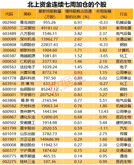 从持股比例变动情况来看,青鸟消防获加仓幅度最大,较7周前增持股数占流通股的比例为6.91%;其他连续加仓的还有三花智控、八方股份、深圳机场、马钢股份等。