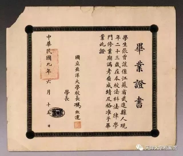 △张太雷毕业证书(原件藏于天津大学档案馆)