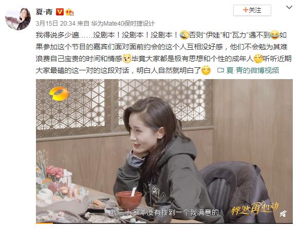 节目制作人也在微博澄清没有剧本,“毕竟大家都是有思想和个性的成年人,不会勉为其难浪费时间和感情。”