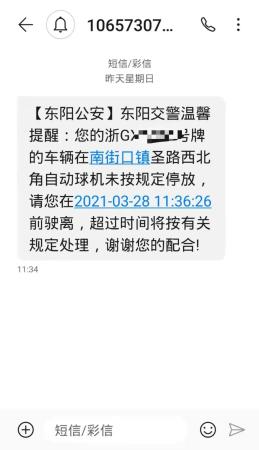原标题:《@东阳车主,违法停车收到这个短信!请及时将车辆驶离》