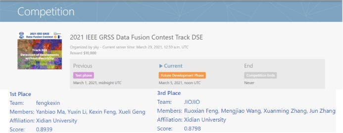 由“马彦彪、李钰鑫、冯可心”组成的学生队伍获得了2021IEEE GRSS Data Fusion Contest Track DSE(数据融合竞赛无电居民区检测挑战赛赛道)冠军。 “冯若贤、王梦娇、张轩铭” 组成的学生队伍获得了同赛道季军。