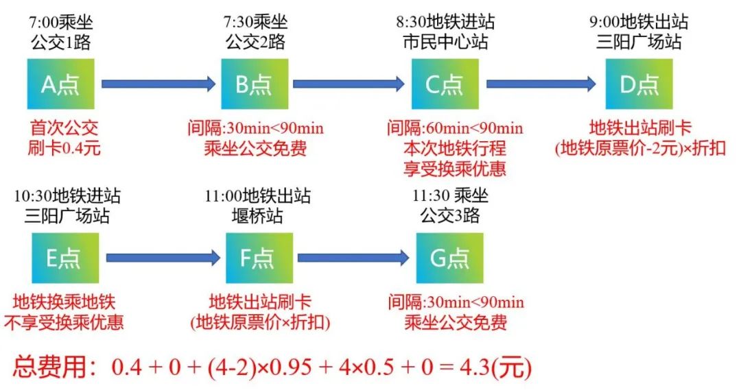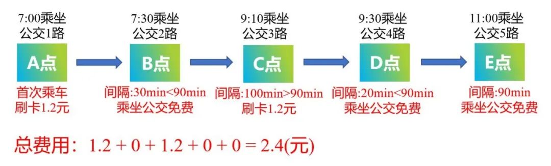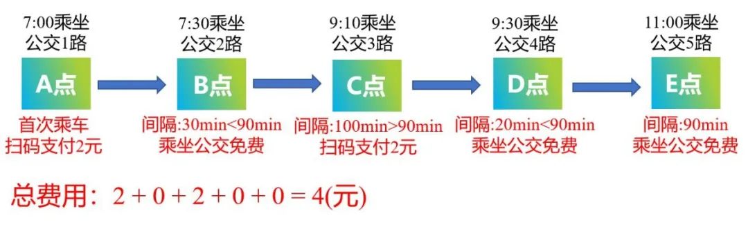 <公交与公交换乘>公交与公交换乘>假设某乘客持普通交通卡于7:00乘坐1路公交(票价2元),于7:30乘坐2路公交(票价2元),于9:10乘坐3路公交(票价2元),于9:30乘坐4路公交(票价2元),于11:00乘坐5路公交(票价2元)。