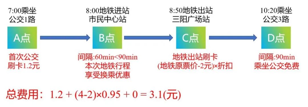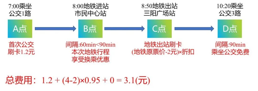 该次出行中,该乘客于7:00支付金额1.2元(2元×0.6),于8:50支付1.9元(本次地铁进站刷卡时间与上次公交刷卡时间间隔60分钟,享受换乘优惠,支付金额为(4元-2元)×0.95),于10:20支付0元(本次公交刷卡与上次地铁出站刷卡间隔90分钟,享受换乘优惠)。