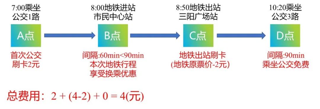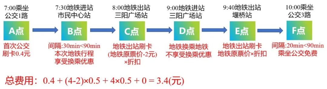 <公交与地铁换乘>公交与地铁换乘>假设某乘客持普通交通卡于7:00乘坐1路公交(票价2元),于8:00刷卡进入地铁市民中心站,于8:50刷卡离开三阳广场站(票价4元),于10:20乘坐3路公交(票价2元)。