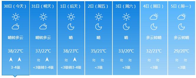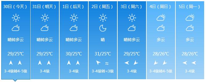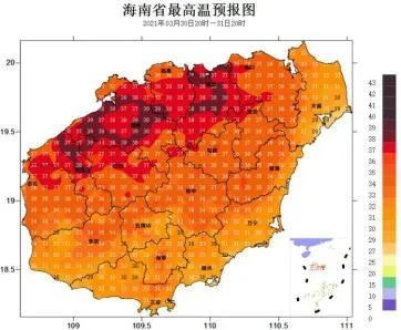 预计3月29日~4月2日,受西南气流影响,全岛晴间多云,西北部局地午后有雷阵雨;最高气温西北半部地区35~38 ℃,部分乡镇可达38℃以上,其余地区31~34℃,最低气温中部山区21~24℃,其余地区25~28℃。