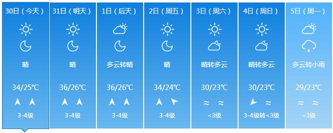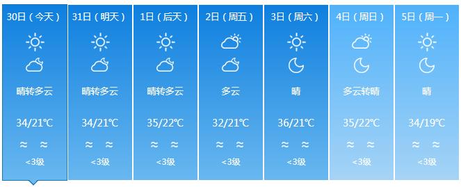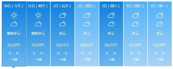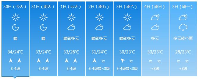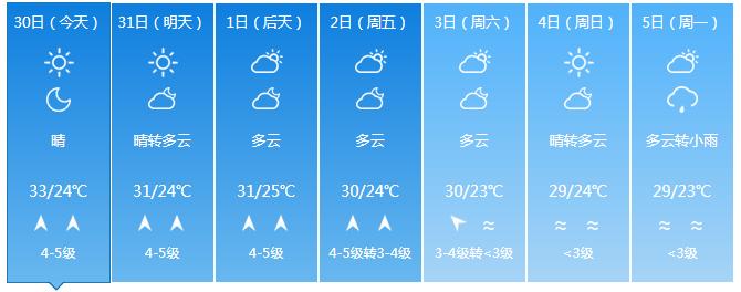 3日~4日,受东南气流影响,全岛多云,东半部地区有分散小雨;气温小幅下降,最高气温西北半部地区33~36 ℃,其余地区30~33℃,最低气温中部山区19~21℃,其余地区22~25℃。