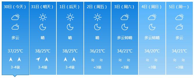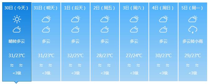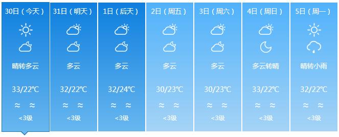 海南省气象台预计,前中期海南岛西北部局地午后有雷阵雨,维持大范围高温天气;后期全岛多云,东半部地区有分散小雨,高温天气缓解。具体预报如下:
