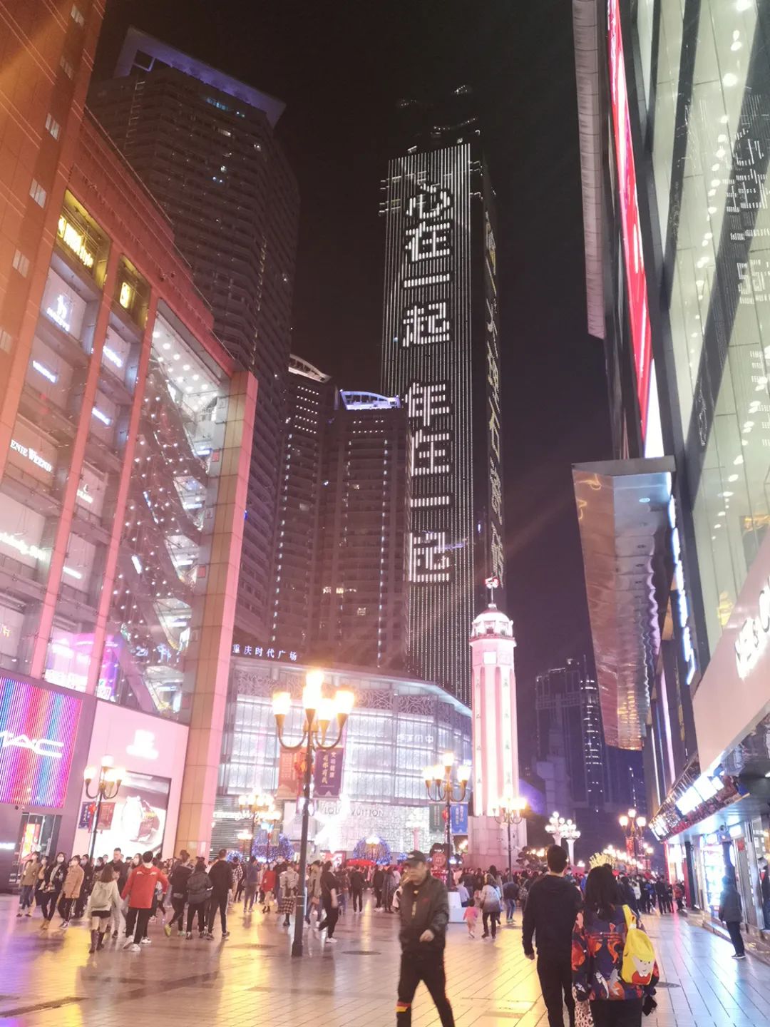 虽然过年思乡情相同,但年度口号却与时俱进。解放碑今年的宣传语除了常规的“金牛祥气蜡灯红”、“牛气冲天 福寿绵绵”等牛年祝福,还有在2020年春节深刻期盼的“国泰民安”和“今年春节不返乡”、“心在一起 年在一起”等对“就地过年”人群的关怀。