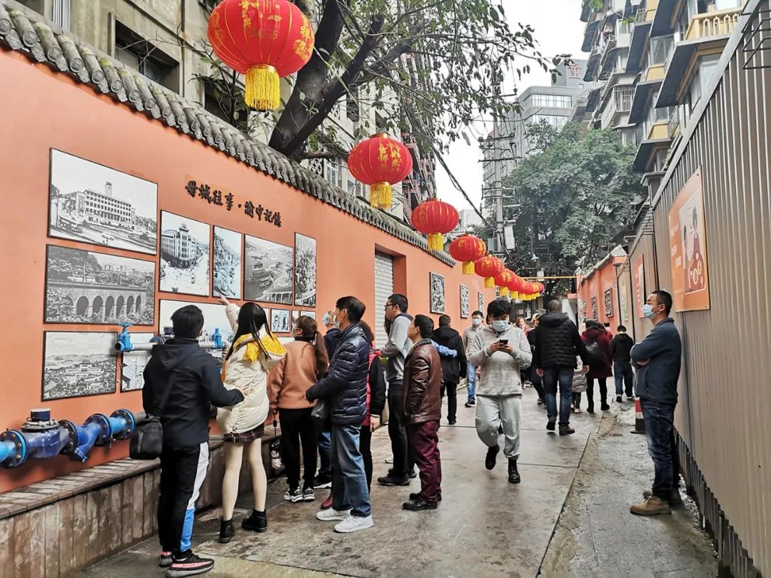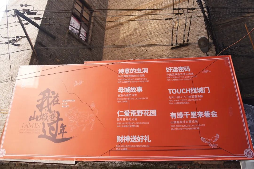 春节期间,山城巷开展了为期34天(2月10日至3月15日)的“母城故事”春游山城艺术季,主要包括开埠图景、市井生活、时代变迁、邀请呈现、特别呈现5个部分,共包含25个小项目,散落在微更新后形成的展示空间和休闲空间里。其中《TOUCH找城门》(九开八闭十七门地图影像展)将重庆古城门的故事娓娓到来;《有缘千里来巷会》(山城巷变迁大事纪展)在金马小学原教学楼二楼迎四方宾客,将看展的陌生人都变为“有缘人”;《好运密码》(中国国家级非遗年画展)位于金马小学旧址内,将地方文化特色解读得淋漓尽致。除了“看”,还有“听”,大年初一至初六,还有“向奎现场讲重庆”,一边听书,一边喝坝坝茶,还可以晒太阳,好不惬意。当然,最受欢迎的还是临山修筑、远眺长江的临江栈道,人来人往,络绎不绝;起伏的红灯笼、复古的照明灯,也平添了几分老重庆的年代感,入夜之后,似乎就能重现“天灯”场景——“远远的街灯明了,好像闪着无数的明星;天上的明星现了,好像点着无数的街灯”。