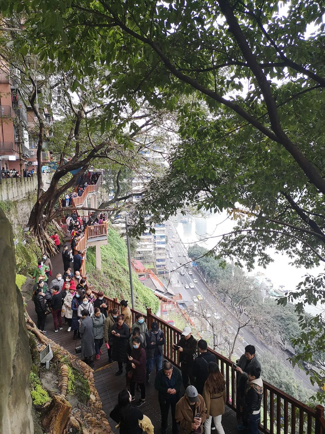 春节期间,这里举办了一场为期16天(2月11日至2月26日)的“戴家巷2021艺术SHOW”——“时光陈列馆”吸引了不少“老重庆”成群结队来怀旧,跟着指示牌走向山体崖壁的途中还可以看“母城往事·渝中记忆”照片展,崖壁处新增的观景平台为近看洪崖洞,俯瞰嘉陵江,远眺江北嘴、黄花园大桥、千厮门大桥提供了绝佳视野。游览的人多为本地口音,其中还有不少人身着红衣,透露出春节的喜气洋洋。