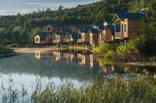 在石木子水库的支流边上,是一排排古朴的木屋,将城市的喧嚣与压力隔绝在外,感受一段静谧、纯粹的原始生活。清早的太阳会透过树叶的缝隙投射进来,傍晚的红霞会掩映在身后层层叠叠的树影当中。