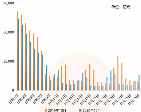 2020年7月影院恢复营业后,迎来的第一个大档期国庆档。因为《姜子牙》《我和我的家乡》的上映斩获39.6亿票房。国庆过后,票房一路下跌,全月工作日平均票房为7218万,比2019年同期下降45%。