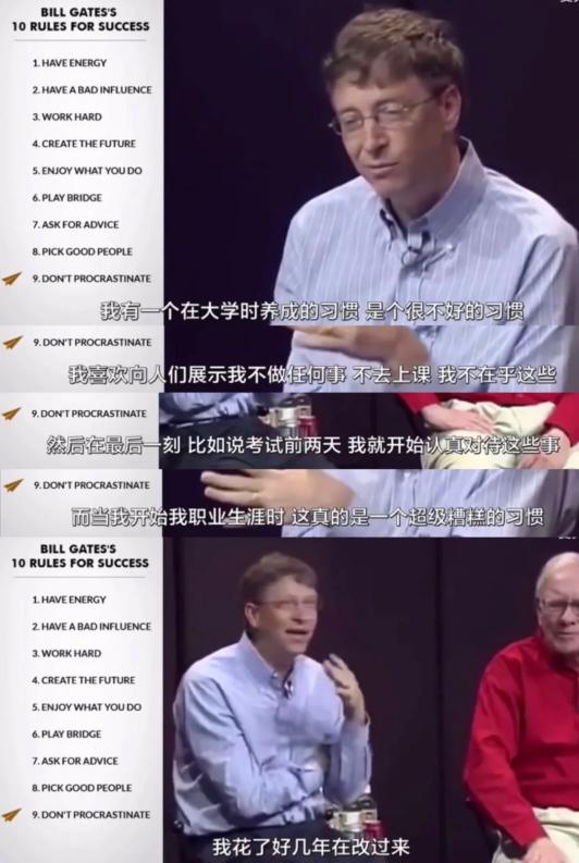 即便是商界名人,也有不少人经历过拖延的困扰。比如比尔·盖茨,曾说自己总喜欢等到最后一刻才干正事,并且花了几年时间才改变这一习惯。