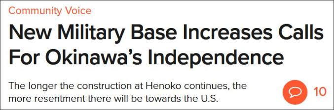 美国调查新闻网站“Honolulu Civil Beat”指出,尽管冲绳原住民长期以来一直反对美军在冲绳设立军事基地,他们担心美军的存在会让冲绳成为战争的牺牲品,但他们的声音一直被日美两国政府所忽视。由于日本和美国一再无视冲绳当地民众的意愿,要求冲绳恢复独立的呼声越来越高。