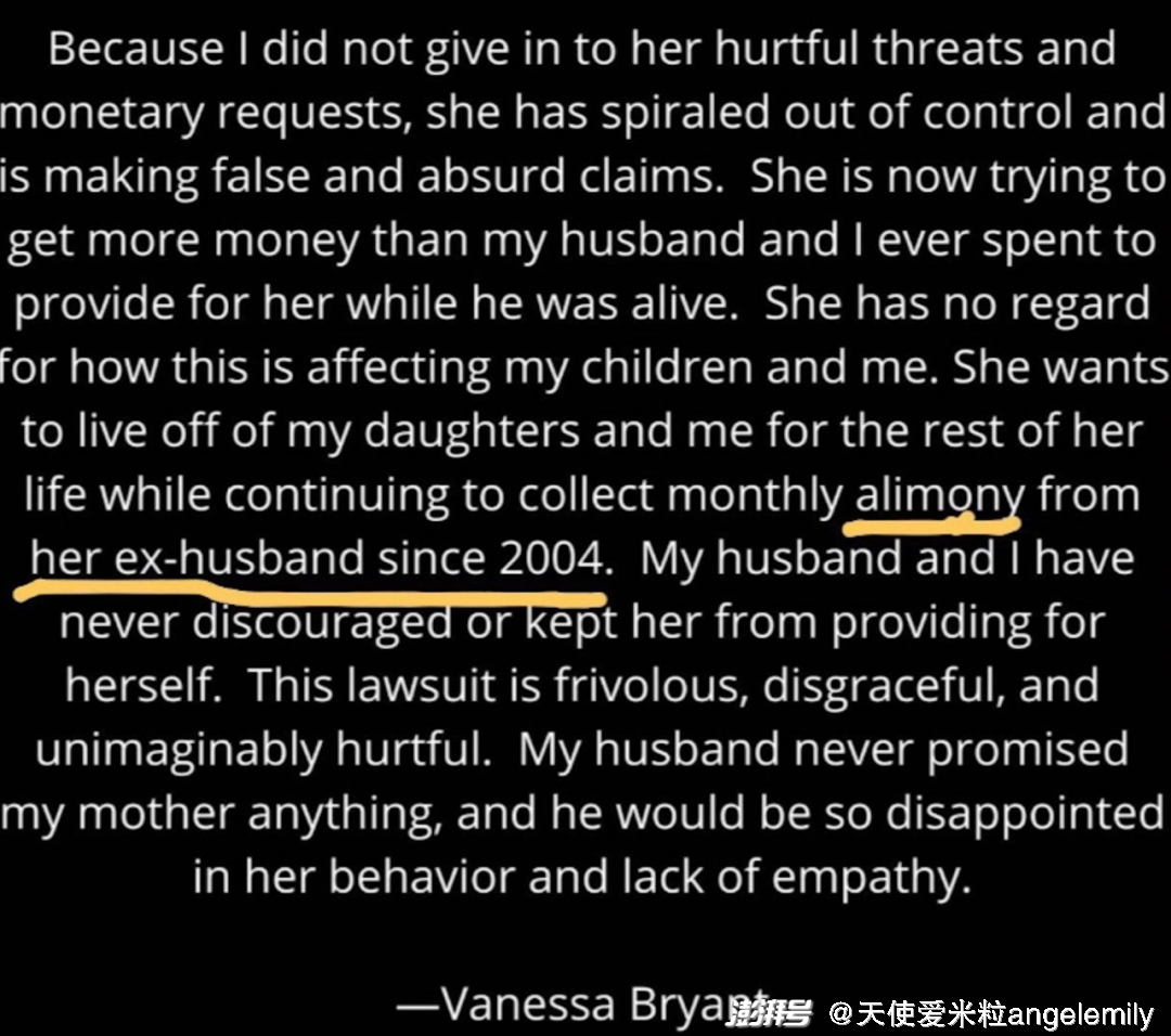 “在过去的20年里,我和丈夫一直在经济上支持她,现在我还在这么做,包括每个月给她赡养费。 科比从未向我母亲承诺过任何事情,如果他知道这一切,也一定会对她缺乏同情心的行为感到非常失望。”
