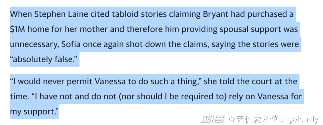 Sofia还声称,科比生前曾经承诺在经济上照顾她:“不幸的是,科比的承诺没有实现,因为他现在已经去世了,凡妮莎特采取了她所能采取的一切措施来撤销我和科比之间的所有承诺。”