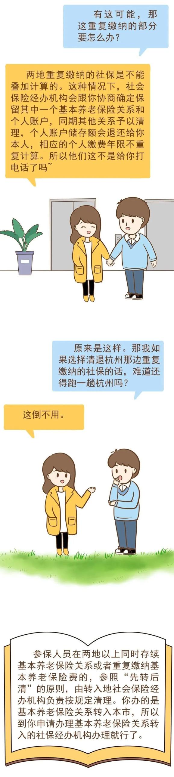 市人社局说,参保人员在两地以上同时存续基本养老保险关系或者重复缴纳基本养老保险费的,参照“先转后清”的原则,由转入地社会保险经办机构负责按规定清理。详见↓