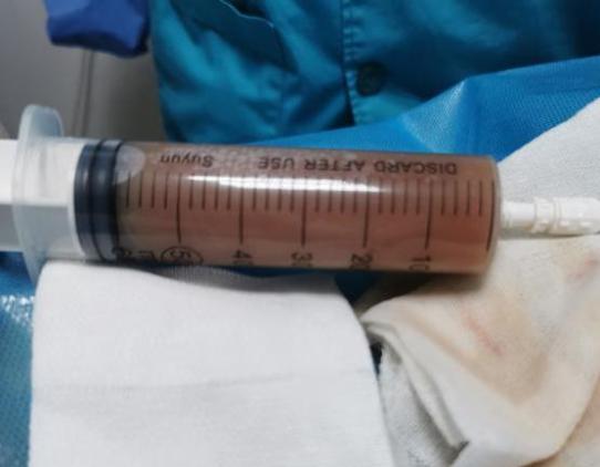 在家属协商,充分告知并签署知情同意书后,晚11点超声介入团队黄毅主任和王思翰医师为患者在超声科介入室进行了超声引导下经皮经肝胆囊穿刺置管引流术。过程顺利,术中抽出灰黄色浑浊液体约70ml,术后患者腹痛症状明显减轻,安返病房。