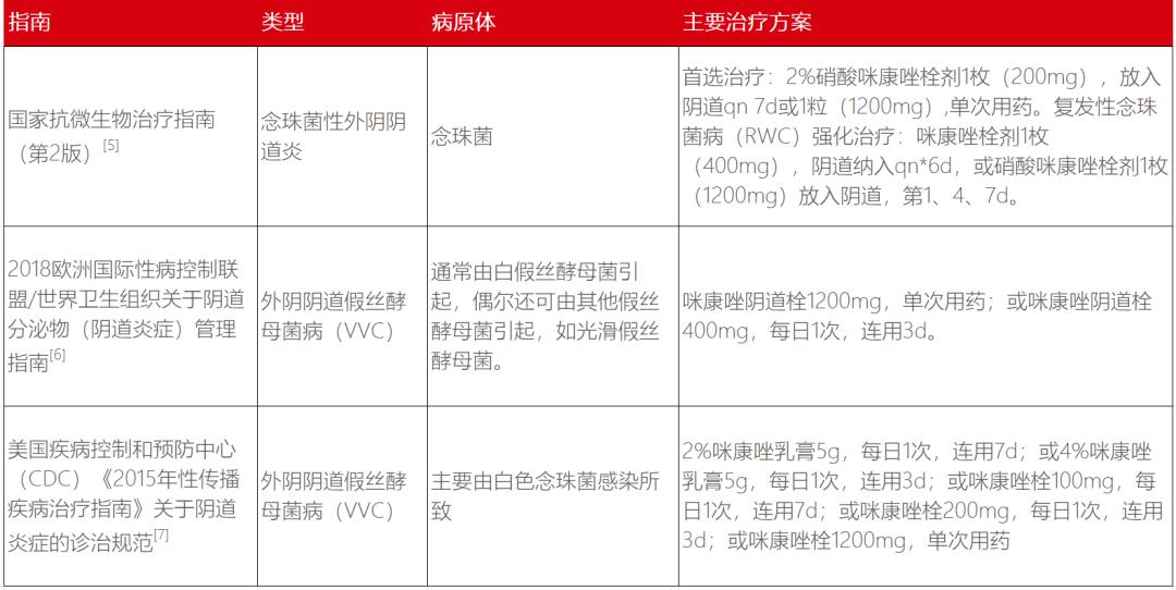适应症:霉菌性阴道炎。国内外指南均推荐硝酸咪康唑用于治疗霉菌性阴道炎,但治疗方案稍有差异,如下: