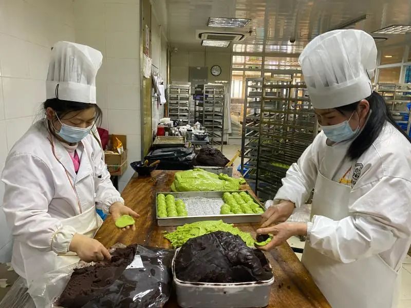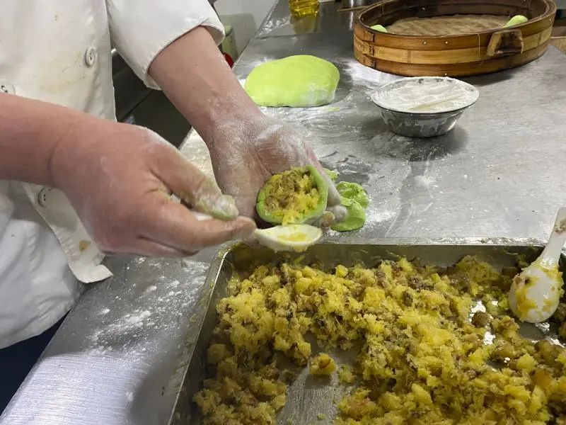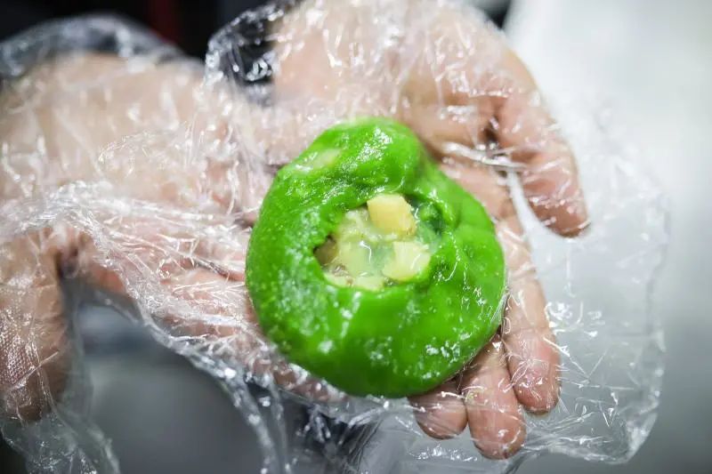 另外,杏花楼青团的糯米皮比较软糯,即使在常温下放一天半天也不会变硬。这不是加了添加剂,而是和面师傅手上的功夫。每个环节都不能偷工减料,“糯米粉吃饱了水,就Q弹不紧绷了”。