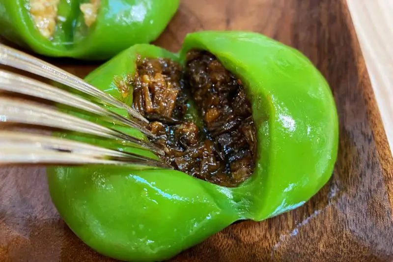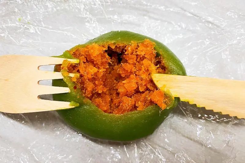 虽说沈大成的这两款青团都主打“辣”,但品尝下来,实际口味都不算很辣。他家的原料也是相当丰富,来自高邮的咸鸭蛋,搭配印度魔鬼辣椒,再配合上些许老干妈,鲜中带辣、辣里回甘,虽然刺激了味蕾,但青团清爽的表皮刚好中和了辣,回味无穷。