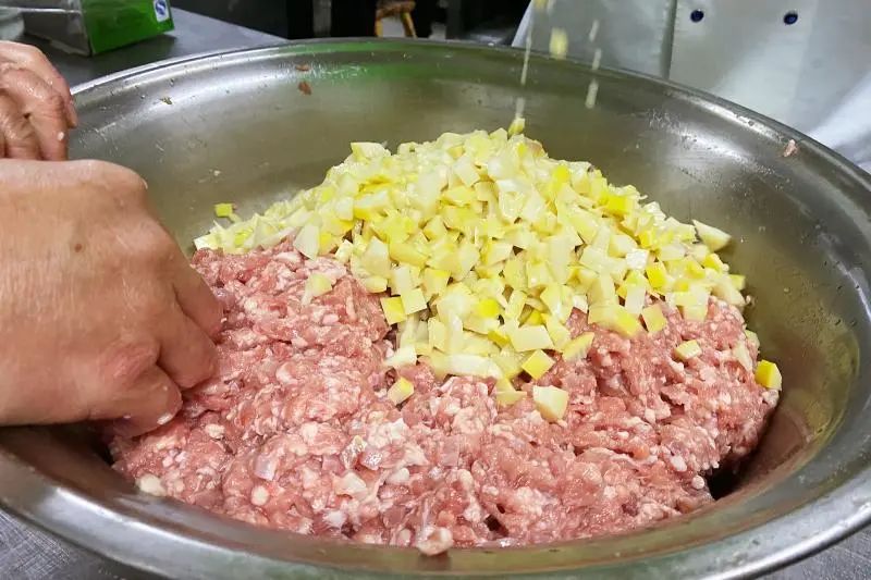 今年,杏花楼推出的新品是“荠菜鲜肉”,虽然其余老字号早有尝试,但比较下来,杏花楼的更有底气。咬开它你会发现,里面混合的居然是肉丁,而不是肉糜。据师傅透露,肉丁选用的是肥瘦均匀的五花肉,而爽脆的藕丁则增加了青团略带微甜的口感。此外,馅料里还用了火腿末“吊鲜”,鲜甜相配,相得益彰。