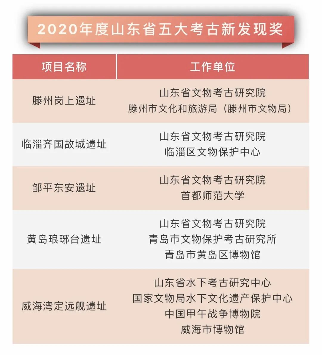 4月2日,从山东省文物考古研究院获悉,滕州岗上遗址、临淄齐国故城遗址、邹平东安遗址、黄岛琅琊台遗址、威海湾定远舰遗址等5个项目获得“2020年度山东省考古新发现奖”。
