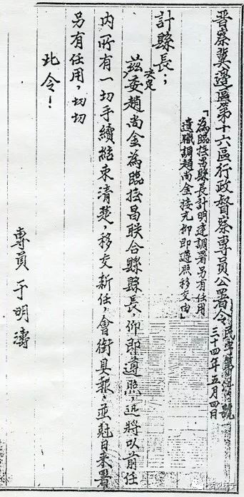 民国三十四年(1945年)5月4日第十六专署专员于明涛任命赵尚金为临抚昌联合县县长。
