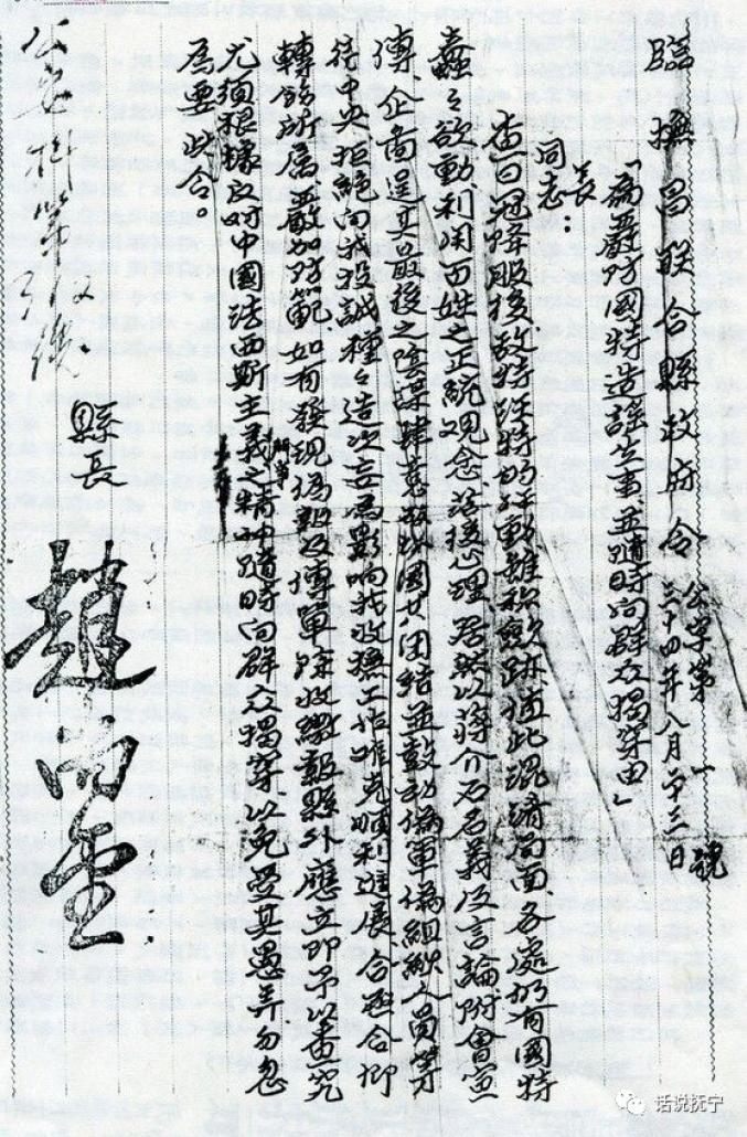 1945年8月23日,县长赵尚金(常庆丰)发布第一号令:“为严防国特造谣生事,并随时向群众揭穿由”。公文格式与当今迥然不同。