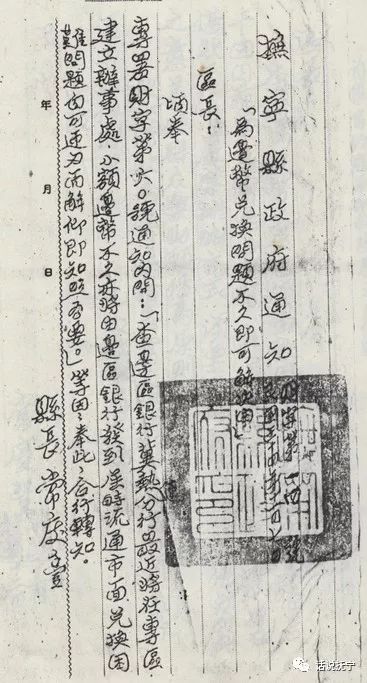 1945年11月7日县长常庆丰(赵尚金)县政府“为边币问题不久即可解决由”的通知