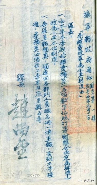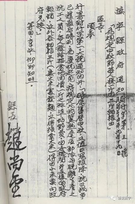 1945年9月19日县长赵尚金签发中秋节每人发一斤肉、三斤细粮的通知,这是抗战后的第一个中秋节,值得庆贺。